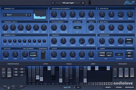 A custom high-power rotary speaker The infamous RA200 cabinet with 3 rotating treble speakers A classic 4x12 non-rotary speaker cabinet simulation Adjustable 3 band output EQExtensive MIDI controller mapping Cherry, Walnut, Mahogany and Walnut cabinet finishes Low memory/disk usage Classic 122, 147 and high power custom rotary speaker simulations3 classic 40 watt rotary speaker tube overdrive simulations and high gain British guitar amp overdrive Completely adjustable rotary speeds, acceleration & deceleration Accurate microphone spread, distance & balance controls Rotary horn diffusers on/off Front stop & Memphis control for rotary speaker Low CPU usage GG Audio has updated Blue3 to version 1.2.0.