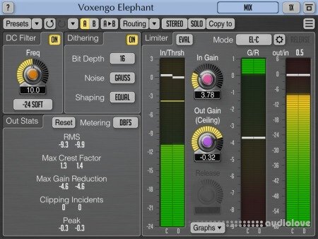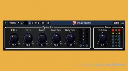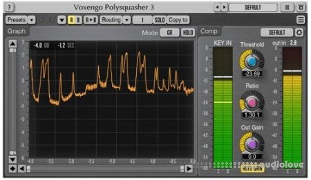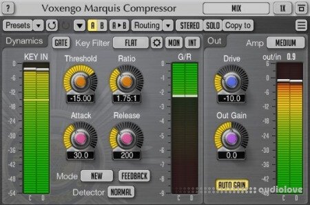 You do not have to worry about common ratio and make-up gain controls since they are automatically selected by the advanced compression algorithm, while the attack and release parameters are stored in a mode preset
